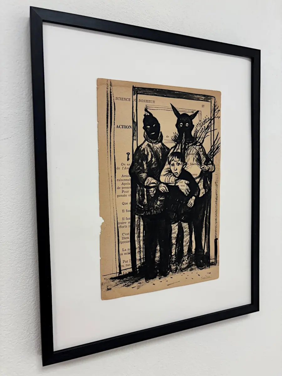 Encre sur page de livre, figures inquiétantes et tendresse mêlée : une scène d’enfance à la frontière du rêve et du cauchemar.