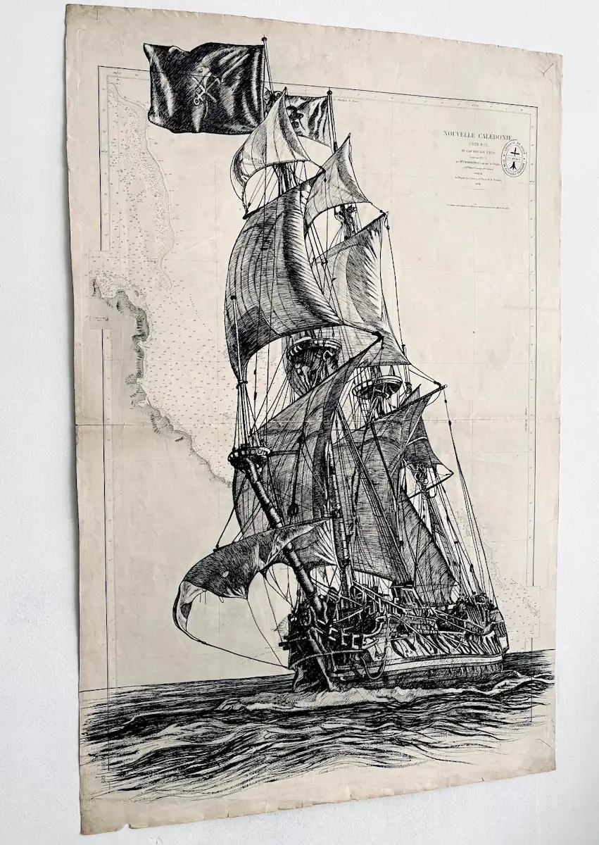 Voilier trois-mâts en pleine mer, dessiné à l’encre de Chine sur une carte marine d’époque (Nouvelle Calédonie, 1876).