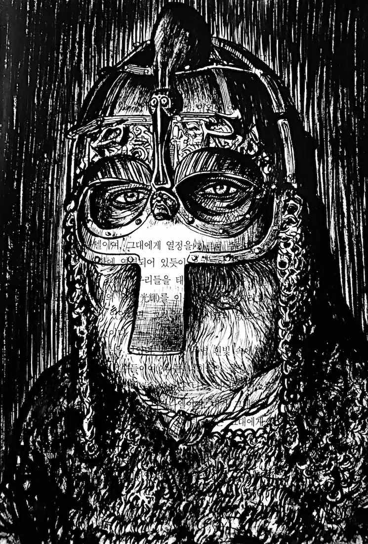 Casque gravé, barbe épaisse, regard implacable : ce visage semble émerger de la page comme un fragment de saga oublié.
